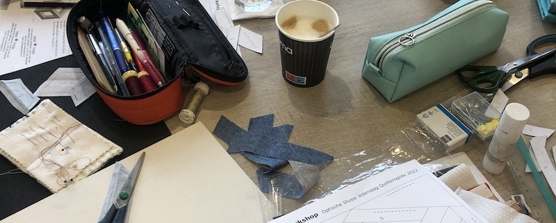 Direct na binnenkomst moesten er stofjes voor de workshop uitgezocht worden en natuurlijk was er koffie met wat lekkers.