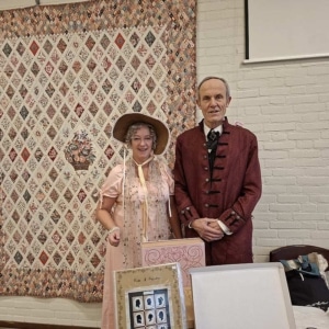 Bij de show-and-tell werden een tiental Jane Austen coverlets getoond. Dat was genieten voor ons allemaal. Helen Hazon had haar 6 quiltjes vanuit Groot-Brittanië gestuurd waarin de boeken van Jane waren verbeeld. Deze quiltjes werden aandachtig bekeken. Erg leuk ze in het echt te kunnen zien.