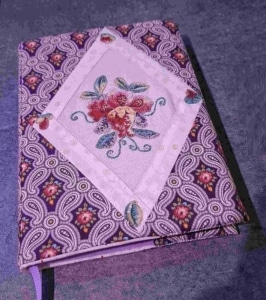 De middagopdracht bestond uit een boek of agendaomslag, formaat A5, met de kenmerkende ruit van de coverlet op de voorkant. We konden uit een klein lapje voldoende bloemen knippen om daarmee een schikking te maken op en over de rand van de ruit.