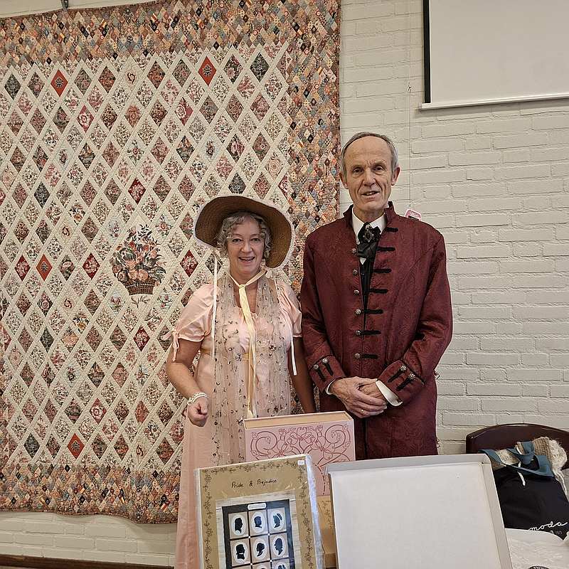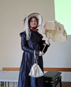 In de ochtend hebben we genoten van een boeiende lezing van Corina van der Linden, historisch costumière voor film en musea, over de kleding uit de tijd van Jane, de Regency-periode. Corina bracht een charmant model mee die kleding showde waar Corina haar uitleg bij gaf. Vanaf haar ondergoed aangekleed tot uitgaanskleding.