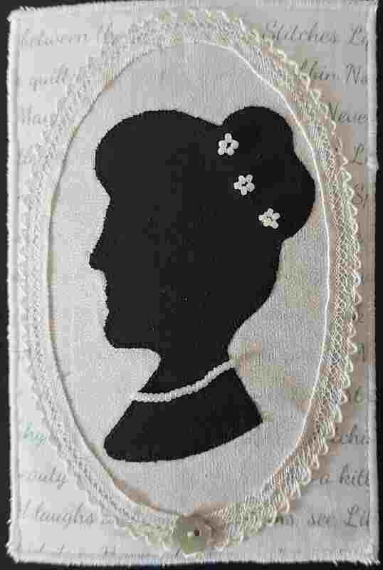 En, omdat Jane een schrijfster was, werd daarna een fabric postcard gemaakt. Die bestond uit 2 lagen stof met een stevige tussenvulling. Het riep herinneringen op aan de vakantie- en verjaardagskaarten die we vroeger veel vaker verstuurden. En een zelfgemaakte kaart is natuurlijk nog leuker om te ontvangen.
