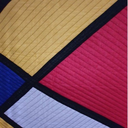 Elke 3 maanden verzinnen we een nieuwe uitdaging. Deze keer hadden we onszelf de opdracht gegeven om een moderne quilt te maken met het onderwerp ‘hashtag’. De quilt moest 80×80 cm groot worden. Ikzelf ben nogal ‘in de schilderijen’. Daarom kwam ik op dit idee. Ik heb 4 stoffen (blauw, rood, geel en wit) van 100 x 100 cm op elkaar gelegd en daar 4x doorheen gesneden. Toen een aantal stukken stof gewisseld en daar zwarte banen tussen genaaid.