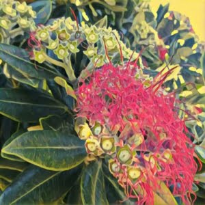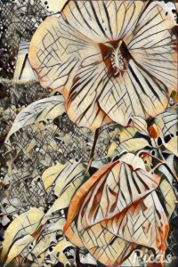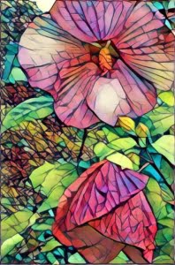 De foto heb ik bewerkt in Picas* en dat laat mij verschillende mogelijkheden zien. Dat helpt me om een andere kleurstelling te kiezen of het beeld meer te abstraheren. Er zijn meer programma’s die verschillende stijlen van een foto tonen. Ook al gebruik ik bijna nooit de betreffende stijl; maar door de foto om te zetten in verschillende stijlen, zie ik beter waar de kracht van het beeld zit. Of welke kleuren verstopt zitten in het beeld, omdat die kleur in alle stijlen terugkomt, en dat zelfde geldt ook voor de lijnen.
