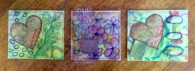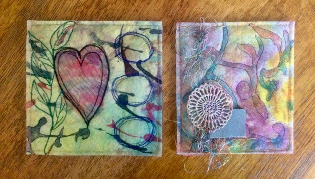 Nu kan ik kaarten gaan maken. Ik wil het een beetje abstract houden, bepaalde details van het verven accentueren. Eerst de lutrador op kaart formaat snijden en erna strijken op fiberfil. Doordat ik er fiberfil onder heb zitten, komt er meer diepte in te zitten met naaien