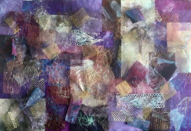 Ik verzamel al mijn stofjes in allerlei paars tinten. Ook de kantjes en gaas komen uit de kast, evenals angelina vezels.