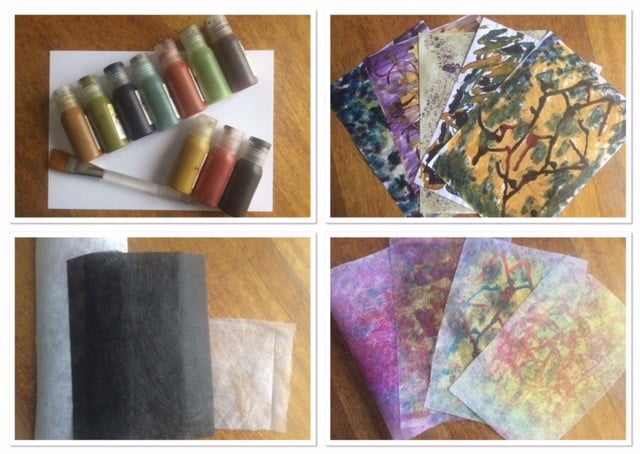 Er staan meer leuke dingen in het boek. Nu ga ik verder met lutrador. Dat is te koop in het wit en zwart en in verschillende diktes. Eerst maar eens de lutrador verven. Dat doe ik met transfer verf, eerst met transfer verf op A4 print papier verven/stempelen/gieten. Dat ziet er “raar” uit, de kleuren worden vele malen mooier als je het geverfde papier op de lutrador gaat strijken