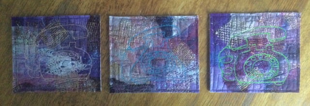 Na het quilten snijd ik de lap in stukken. Natuurlijk wil ik niet hetzelfde motief gebruiken als wat in het boek staat. Ik kies voor zo’n leuke telefoon, die we allemaal nog wel kennen, maar waarschijnlijk niet meer in huis hebben.