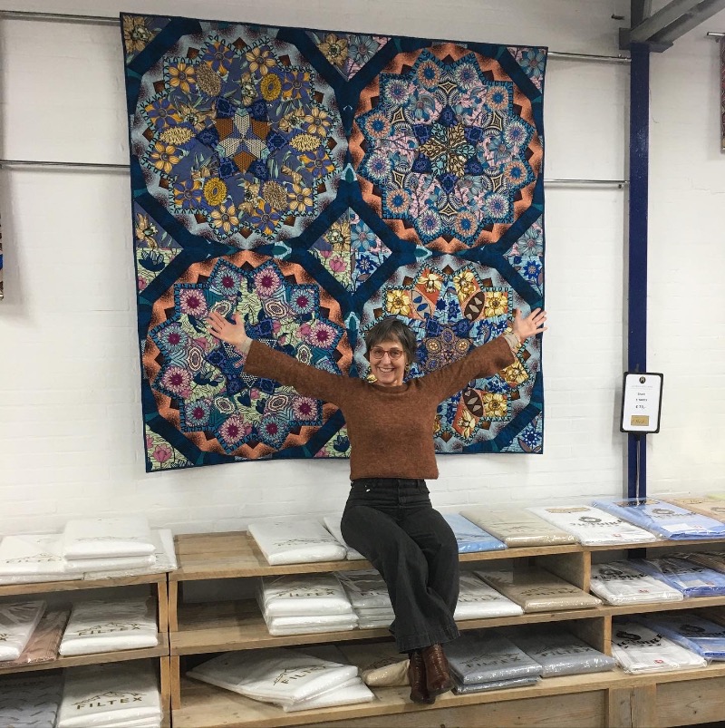 Oh ja, die ene quilt waar ik de vorige keer over schreef? Die heb ik Baroque in Blue gedoopt en hangt nu bij de stoffen fabrikant in de showroom/winkel. Deze quilt zal straks ook te zien zijn op de Quit tentoonstelling in Nantes!