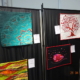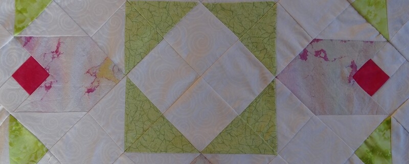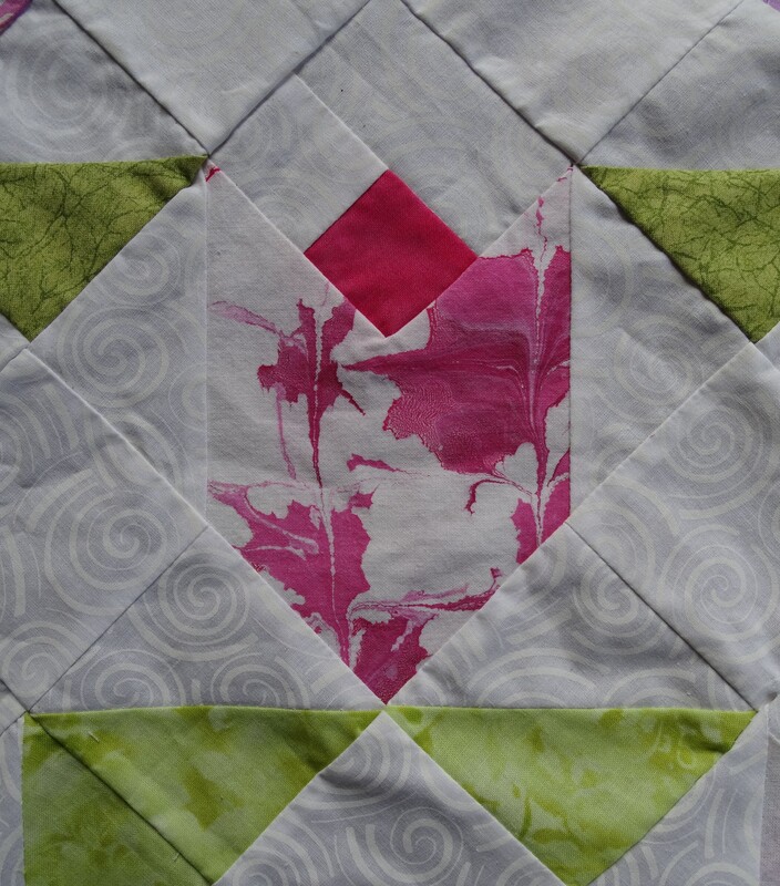 Drie kleuren groen, drie kleuren lila en een witte achtergrond heb ik nodig. De groentinten en de achtergrond koop ik. De bloemtinten heb ik in huis. Het zijn zelf geverfde Ebru-lappen. In roze-lila tinten. Ik vind het jammer om in deze prachtige Ebru-patronen te knippen. Daarom laat ik de naden in het bloemdeel vervallen. Zo blijft het Ebru-patroon heel.