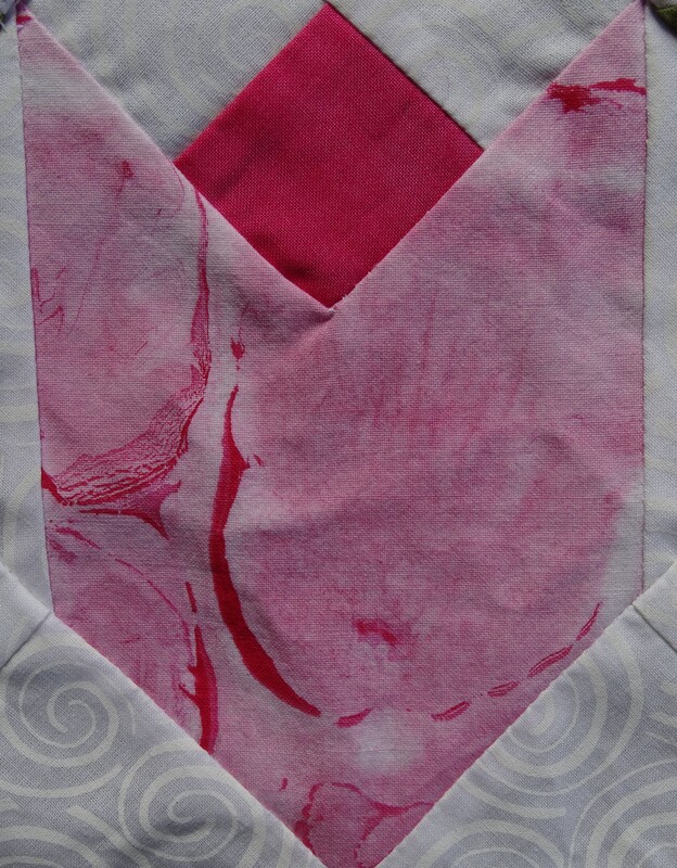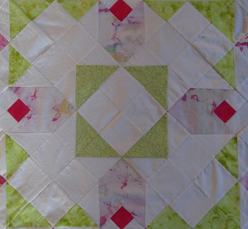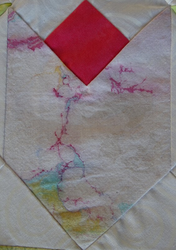 Het originele patroon volg ik. De kleuren laat ik van licht naar donker en van zacht naar fel verlopen. Lichtgroen met lichte ebru lapjes vormen de bloemen van het middenstuk. Daarna volgt een rand met lindegroen en felroze bloemen. De laatste rand wordt groen met lila tinten. Kleurgebruik is heel persoonlijk. Zuurstok is mijn lievelingskleur. En die zit erin!