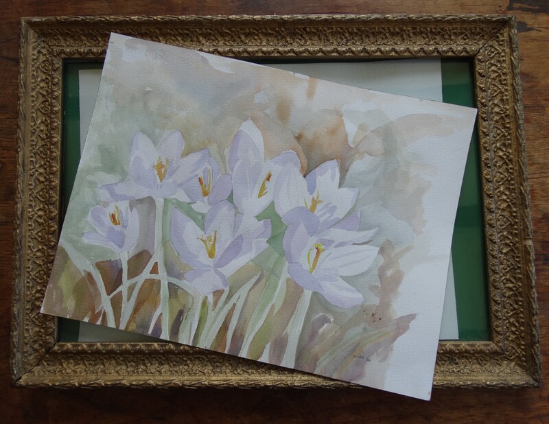 Inspiratie halen uit alles wat groeit en bloeit, doe ik graag. De natuur volgen, leerde ik al vroeg. Als kind dacht ik dat die krokus in november een voorbode was van de lente. Dat prachtige lila bloemetje is echter een plantje uit de herfsttijloosfamilie. Een plantje, tijloos/tijdeloos, dat in de herfst al bloeit en het blad pas in het jaar daarop laat zien. Wel een bijzonder plantje, want het staat op de ‘Nederlandse Rode Lijst 2012 Vaatplanten’ (met zeldzaamheidsklasse ZZ= zeldzaam, trendklasse= matig afgenomen). De kleurcombinatie van bloem en meeldraden vind ik prachtig. Reden voor mij om in 2003 deze aquarel te maken.