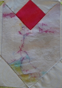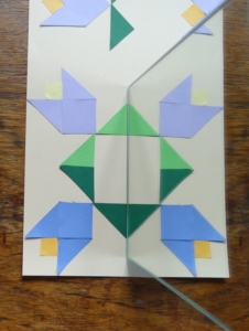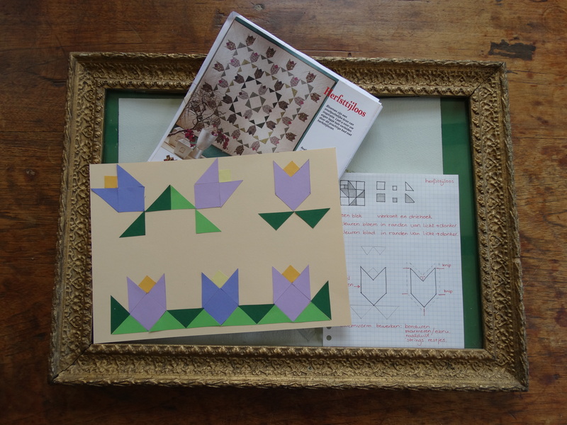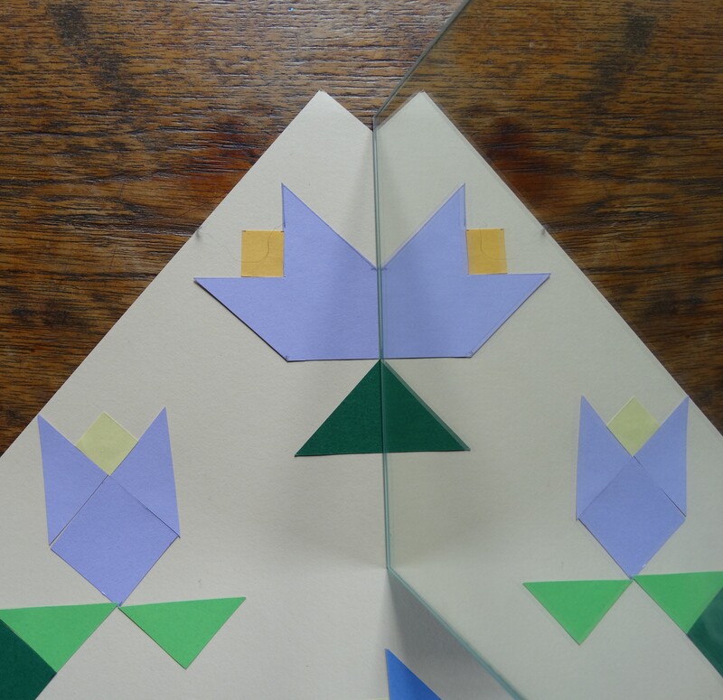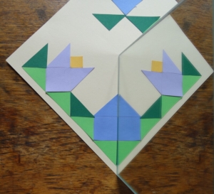 Graag begin ik met tekenen van het blok om het dan uit gekleurd papier te maken. Door het tekenen, knippen en plakken, creëer ik denktijd voor mijn ideeën. Ja, dat kan ook op de computer, er zijn allerlei programma’s voor kleur en ontwerpen. Zie mij maar als een ‘slow-cooker’. Ik heb tijd nodig, wil het voor me zien en doen. Eén blok bestaat uit driehoeken en vierkantjes. Door deze net iets anders te leggen, ontstaan randen en hoeken. Ook het effect van kleuren wisselen is leuk. Door het spiegeltje zie ik het effect van de herhaling. Uiteindelijk besluit ik het originele patroon te volgen en het spelen met kleuren uit te werken.
