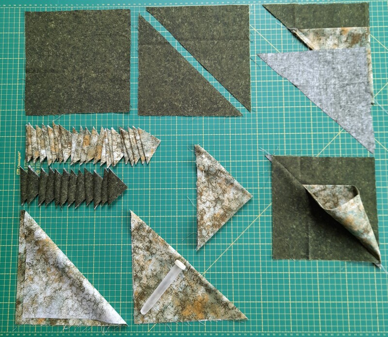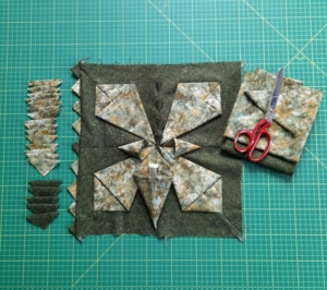 Tijdens die Regiodag gingen 100 quilters aan het werk met het kerstster-patroontje. Een erg leuk werkje met een prachtig resultaat. Ware het niet dat ik graag mijn ‘persoonlijke touch’ aan een patroon geef. Zo ontstond mijn idee voor een bloemenvaasjesquilt. Voor die allermooiste ‘wild’ pluk boeketjes. Mijn persoonlijke touch; de sterpunt niet diagonaal maar verticaal plaatsen, andere kleuren gebruiken en een bloemenstekertje in de punt plaatsen.