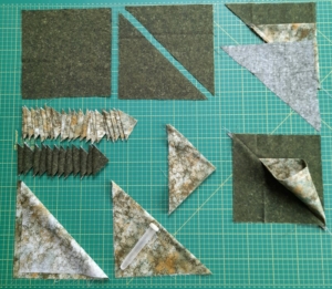 – Het vierkant niet diagonaal doorsnijden, maar halveren. Het diagonaal gevouwen ‘patatzakje’ met de open zijden verticaal langs de lange zijde leggen. De andere helft van het vierkant erop leggen en de zijde stikken. Je stikt door zes lagen. Daardoor verdwijnt wel de stervorm. Je krijgt er vier ‘vaasjes’ voor terug.