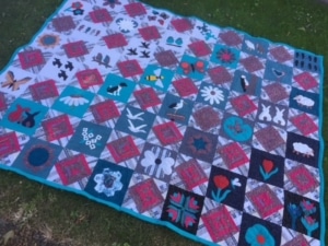 Dat werd mijn derde project. Ik had inmiddels een aantal blokken liggen. De gepiecte blokken in rood, de geappliqueerde blokken in vooral rood en groen. Toen ik ze om en om uitlegde bleek dat best bij elkaar te passen. Op internet vond ik een ‘quilt-as-you-go’ methode die ook het doorquilten overzichtelijker en gemakkelijker maakte. Dus ik besloot het te gaan proberen. Eerst verder werken aan de blokken, 80 in totaal. En daarna het quilten en afwerken.