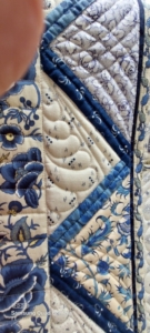Ik vind het heerlijk om alleen in een vreemde stad te reizen en zo wat couleur locale mee te pikken. Aangekomen bij de tentoonstelling mocht ik gratis naar binnen vanwege Happy Hour. Snel doorgelopen om te zien waar en vooral hoe mijn quilt erbij zou hangen. Na enig zoeken kwam ik op de Nederlandse afdeling van Quiltmania en daar hing hij op een prachtige, prominente plek. Ik liep naast mijn schoenen van trots. Merkwaardig om vreemden jouw quilt te zien bestuderen en met telefoontjes detailopnamen te zien maken. Dan zien ze meteen wat er allemaal mis mee is. Maar nee, ik kreeg niets dan lof. Kortom: deze ervaring is een zalfje voor de ziel.