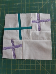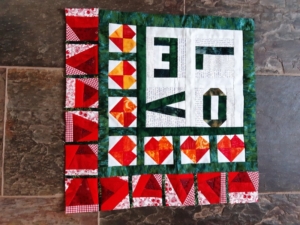 De volgende stap was het blok van Ellen, waar ik de tweede toevoeging aan maakte. Het thema was duidelijk liefde, dus ik maakte er een soort onregelmatige roos van, met Foundation Paper Piecing. Ook hier had ik niet echt een modern gevoel bij, maar het was in ieder geval al wel leuk.