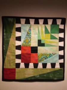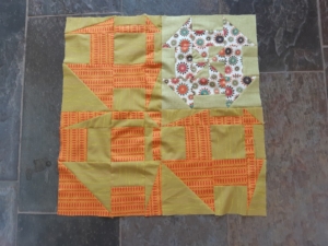 Daarna kreeg ik het blok van Ans. Zij had een traditioneel blok aangepast. Het waren leuke moderne stofjes, maar het blok zelf maakte op mij nog niet zo’n moderne indruk. Daar wilde ik wat aan doen, door het blok een paar keer te herhalen en ook een keer de stofjes “in negatief” gebruiken. Dat resultaat was niet wat ik ervan gedacht had. Ik hoopte maar dat de dames na mij er wel iets leuks en moderns van konden maken.