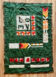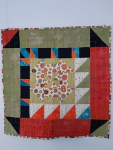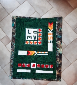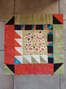 Hoi, daar ben ik weer, Gerie. Dit keer als lid van de moderne quiltgroep “Op de Hooidonk” uit Den Dungen. Vorig jaar hebben we met z’n vieren een Round Robin gemaakt, met als enige voorwaarde dat we allemaal starten met een blok met hetzelfde formaat.