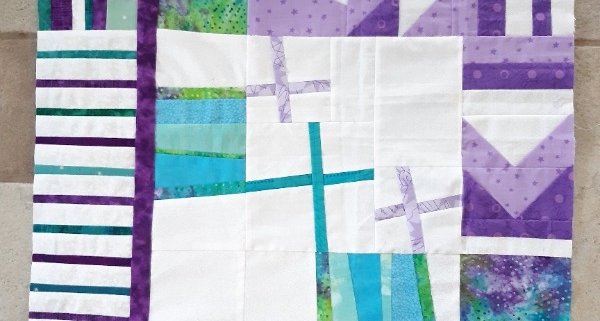 Dit is mijn beginblok. Ik ben momenteel nogal met improv (improvisatie) bezig, dus heb ik een groter en twee kleinere improvkruizen gemaakt. Improv wil onder meer zeggen dat je geen vooropgezet plan hebt, hoe je quilt eruit komt te zien. Je begint gewoon te snijden/knippen en aan elkaar te naaien. Helemaal zonder plan is ook niet nodig. Van deze techniek kun je een hele quilt maken, allemaal improvplussen, groter, dikker, kleiner, dunner, recht, scheef. Dan heb je een globaal plan van aanpak, maar geen plan voor de hele top. Toen mijn blok in elkaar zat, bedacht ik me dat het misschien leuker was geweest om 1 kleinere plus om te draaien, voor een betere verdeling over het blok. Ach ja, nieuwe ronde, nieuwe kansen. Ik vind dat veel negatieve ruimte (het wit, in dit geval) een quilt een moderne look geeft. Met mijn beginblok wilde ik meegeven: veel negatieve ruimte, improv, lijnen, kruizen, paars, wit en turquoise. Anny, die mijn blok als eerste ontving, wist niet meteen wat ze met al die negatieve ruimte moest doen.