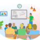 Nadat er een leuke compositie is ontstaan ingekleurd met kleurpotloden om het gebruik van stoffen te benaderen. De tekening op freezerpapier overgenomen, in patroondelen geknipt en op de achterkant van de stof gestreken.