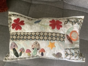 De quilt heeft nog geen bestemming; ik maakte hem vooral om de techniek onder de knie te krijgen. En ik kon het niet laten: ik heb er zelfs een bijpassend kussentje bij gemaakt.