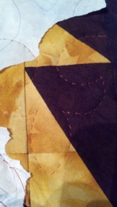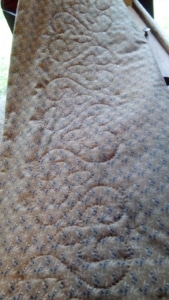 Het quiltmotief heet ‘Wrought Iron’ en doet denken aan een oud gietijzeren hek van een park. Ik tekende het over op theezakjespapier en quiltte daar doorheen.