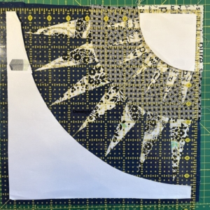 3. Een masker aanbrengen op je vierkante liniaal, waarbij de kleine kwart cirkel en het achtergrondstuk met de grootste boog gemarkeerd zijn. Deze maten zijn bij elk blok (vaak zo in een NYB quilt) gelijk en zo kun je het blok bijsnijden dat dit zo goed mogelijk aansluit. En tegelijkertijd kun je erop letten dat de punten aan de zijkant nog ¼ inch naadtoeslag hebben, zodat de punt niet in de naad verdwijnt.