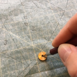 4. Snij de naadtoeslag per gebogen patroondeel exact, want zo kun je de boogdelen goed op elkaar spelden. Ik teken de naadtoeslag op het patroon met een 1/2 inch koperen schijfje met een gat voor je potlood, daarmee kan ik de bocht goed volgen op een constante 1/4 inch.