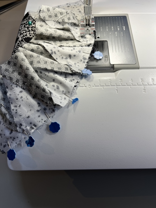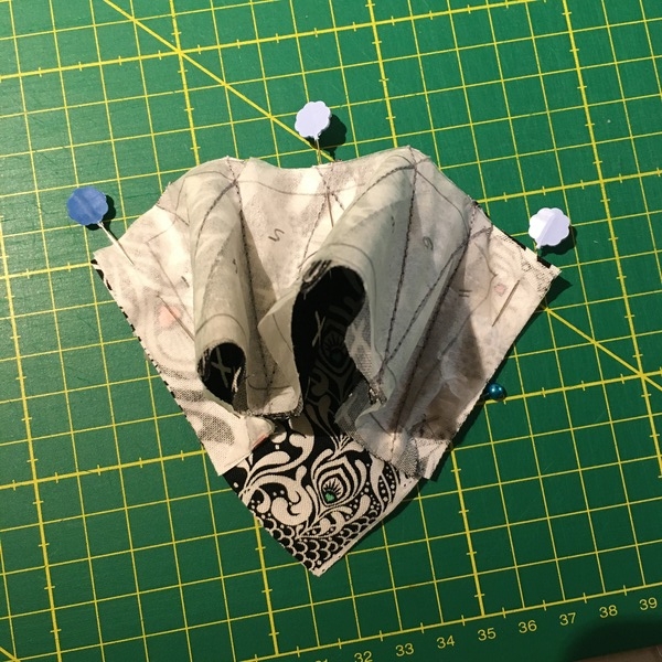 5. Speld de gebogen delen voor het naaien aan elkaar voor een precieze aansluiting. Ik maak een vouw in het midden en op een kwart van de boog en leg deze markering op elkaar en speld dan de tussengelegen booggedeeltes. Wanneer er punten bij elkaar komen op de naad, dan speld ik elke punt.