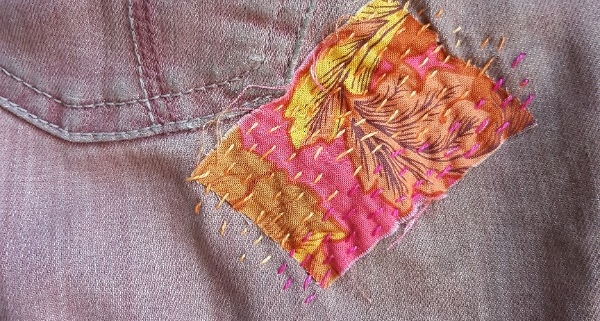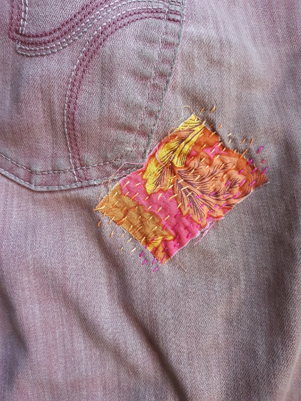 Elkaboka dus. Nooit van gehoord? Klopt, ik heb de term onlangs zelf samengesteld. Het betekent: Elementen van Kantha, Boroboro en Kawandi. Drie vormen van borduren om lapjes op te leuken. Ik heb uit elke stijl precies dat gepakt wat ik het leukste vind. Dus gewoon lekker blik op oneindig, zo eenvoudig mogelijk, niet nadenken, gewoon aan de gang. Om te oefenen heb ik eerst mijn tuinwerkbroek gerepareerd met visible mending (zichtbaar repareren). Leek me ook leuk. En duurzaam.
