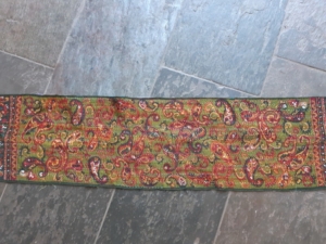 Blijft over iets anders quiltigs. Dus dat wordt mijn Elkabokasjaaltje. Of omslagdoek. Ik weet het verschil niet tussen een sjaal en een omslagdoek. Maar goed, ik noem het verder sjaaltje, pin me er niet op vast. Ik heb dus een sjaaltje dat ik niet zo mooi vind. Een groen/oranje paisley bedrukking.
