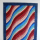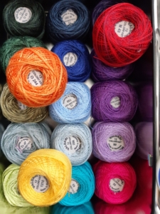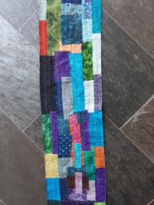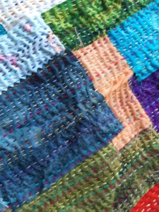 (Op de foto staan de borduursteken er al op, daar kun je even doorheen kijken 😉 Best aardig, maar het past niet bij mij. Dat sjaaltje wil ik dus opleuken met allerlei afvallapjes. Lekker duurzaam, goed bezig Gerie. Schouderklopje voor mezelf. En mooie garens, nieuw gekocht bij het quiltfestival in Nantes.
