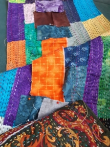 Bij Boroboro hoeven de steken niet zo netjes allemaal precies even groot op de zelfde afstand, als bij het bekendere Sashiko. Zo goed als geen regels, precies goed voor mij. Dus ik wil het vrije van boroboro, met de ondergrond en de manier van lapjes leggen van Kawandi, met de mooie gekleurde garens van Kantha.