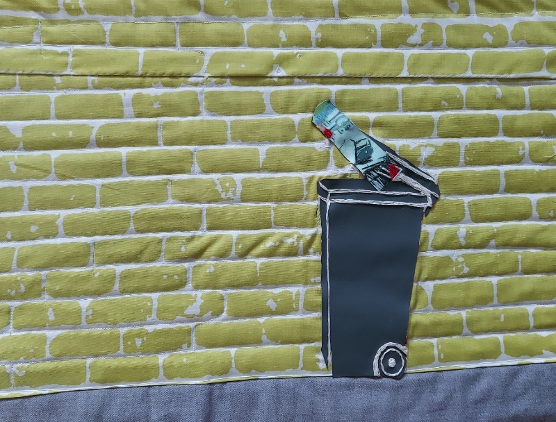 Na de basiscursus quilten ging ik vol enthousiasme het geleerde combineren met mixed mediatechnieken. Mijn eerste project was een vierluik met 2 skateboards in de hoofdrol: een skateboard belandt in een vuilnisbak maar werkt zich daaruit (foto 1). Belaging door een ander skateboard pakt ongunstig uit voor de belager (foto 2).