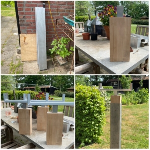 Na allerlei ideeën, waarvan de meesten bij mijn lief technisch wonder sneuvelen als onuitvoerbaar, ontstaat er uiteindelijk een werkbaar plan . Een voet van aluminium met hout en daarop het kunstwerk in een smal min of meer zwevend aluminium profiel. Wat een gedoe om het juiste materiaal te verzamelen en het maken. Met het behulpzame bedrijf van mijn buurman wordt het aluminium gelast.