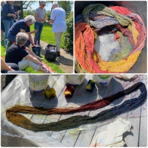 Tussen al dat hersen gekraak doe ik ook leuke dingen hoor, zoals een ontspannen dagje verven bij weefatelier de Rozengang. Een prachtige buitendag met een leuk resultaat. Wat ga ik ervan maken; Berkelland?,Fryslan, maar dan met wat meer blauw? of de Weerrbibben met meer groen? Ik kan er nog even over nadenken. In ieder geval wordt het voor de nieuwe uitdaging een quilt met zelf geweven stof. Ha, valt het kwartje al bij jullie, dit gaat in de uitvoering weer problemen opleveren.