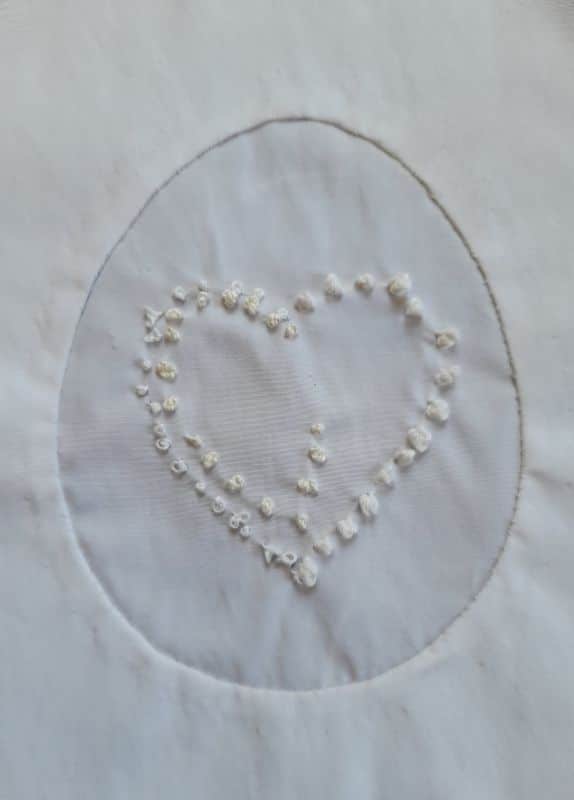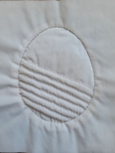 Het stippling rondom een vorm, zorgt ervoor dat het onbewerkte deel omhoog komt en gevuld lijkt. Het stippling lijkt chaotisch, maar is het zeker niet. Contentieus volg je de vorm in fijne quiltsteek.