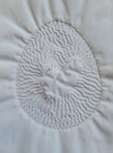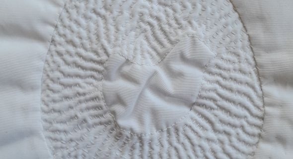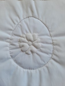 Mooi dat wit op wit! Komen de effecten zo subtiel maar helder uit. Wat me verder opvalt is dat er zoveel namen lijken te zijn voor dezelfde steken of technieken, zoals Boutis en Trapunto. Want is ook de Koloniale knoop dezelfde als de Engelse knoop, en Stippling hetzelfde als Furrowing? Zo ja, waarom zou dat zo zijn? Tijd voor een Encyclopedie :)