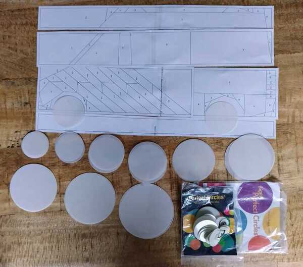 Dit kon ik aanpassen met de blokken van de achtergrondstof. Ik heb per strook de voertuigen gemaakt en aan elkaar gezet. De wielen maakte ik als applicatie er pas op nadat ik de donkere achtergrond strook er aangenaaid had. Met behulp van Perfect cirkels van Karen Kay Buckley maakte ik de definitieve keuze voor de wielmaat. Mijn man had het steeds over velgen die er echt ook op moesten. Dat heb ik ook gedaan en inderdaad is het zo mooier. Voor de wielen, velgen, ramen, koplampen en achterlichten gebruikte steeds dezelfde stof. Bij de hoogwerker heb ik de kabels van dunne gedraaide koortjes gemaakt en deze er later net als de wielen opgenaaid.
