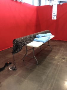 En wat een luxe. Alle quilts, ook de collectie moderne quilts die verzonden was vanuit Nederland, werden door de organisatie opgehangen. Het zag er geweldig uit met die gekleurde achterwanden. In het blogbericht van Monica lees je haar verslag van de beurs.