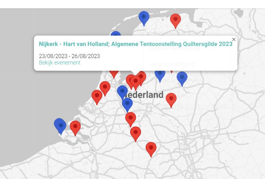 Als je klikt op een icoontje, dan krijg je een bepaalde activiteit te zien. In het voorbeeld hieronder heb ik geklikt op de Algemene Tentoonstelling van het Quiltersgilde in Nijkerk, die van 23 tot en met 26 augustus 2023 zal plaatsvinden. Door te klikken op “Bekijk evenement”, kom je op een pagina terecht waar je meer informatie over de activiteit kunt vinden. Overigens, het voorbeeld hieronder is slechts een foto. Als je het zelf wilt uitproberen, kun je dat hier doen: https://www.quiltersgilde.nl/agenda-overzicht/