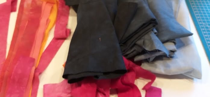Ook daarvoor had ik de stoffen zelf geverfd met de kleur ONYX van Procion. Hiermee kun je een mooie zwarte kleur verven (Wel meer verfstof gebruiken dan aanbevolen) maar er komen bij het verven van een gradatie ook heel mooie grijzen tevoorschijn. Van deze verfsessies had ik nog veel stof liggen dus een deel daarvan heb ik bij de gekleurde repen gehouden.