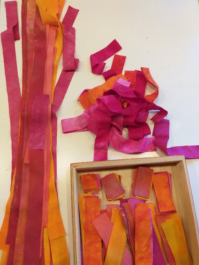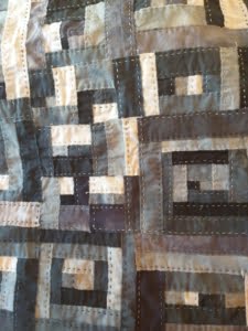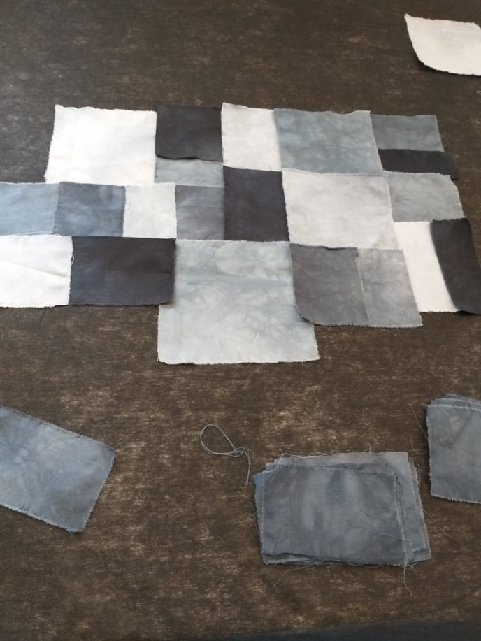Toen kwam het moment om de lapjes op elkaar te zetten. Ik gebruik daarvoor een borduurgaren wat ik met de stof heb mee geverfd. In een eerder, klein werk, ziet dat er zo uit: