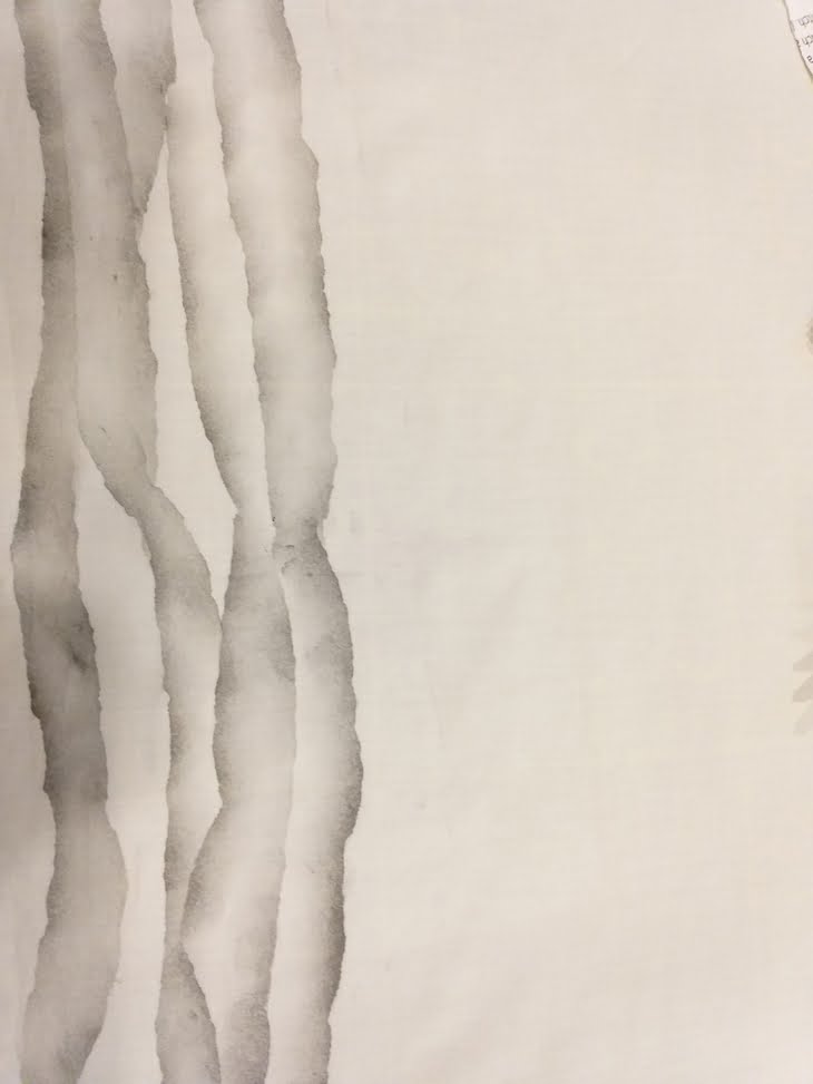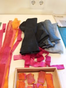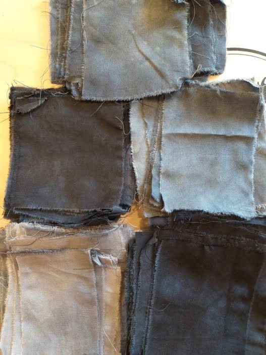 Ook daarvoor had ik de stoffen zelf geverfd met de kleur ONYX van Procion. Hiermee kun je een mooie zwarte kleur verven (Wel meer verfstof gebruiken dan aanbevolen) maar er komen bij het verven van een gradatie ook heel mooie grijzen tevoorschijn. Van deze verfsessies had ik nog veel stof liggen dus een deel daarvan heb ik bij de gekleurde repen gehouden.