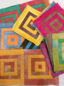 Maar toen Corona weer opvlamde, kreeg ik behoefte om met kleur aan de gang te gaan. Ik had nog een UFO in een doos met log cabin blokken van handgeverfde stoffen. Nou ja, het was niet eens een ufo want op een paar blokken na waren het allemaal gekleurde repen, netjes op maat gesneden. Misschien kon ik daar wel wat mee.