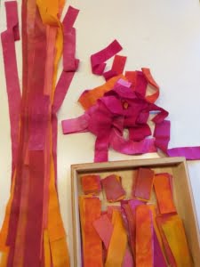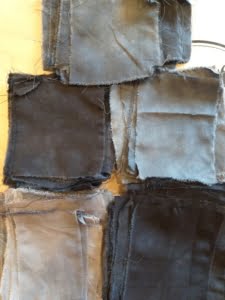De combinatie beviel me goed, maar nu nog een ontwerp, een plan. Na een paar dagen denken en dubben had ik een redelijk duidelijk idee voor ogen. Het mocht niet te “netjes” worden. Ik besloot daarom om de stoffen te scheuren in plaats van te snijden. Ongelijke rechthoeken en vierkanten. Helemaal willekeurig.