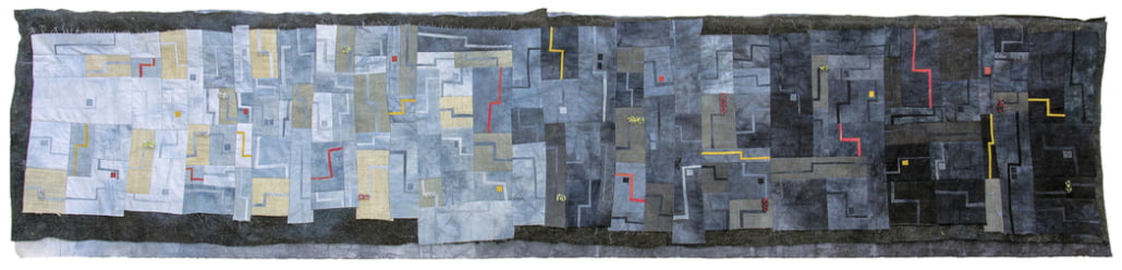 Toen de vlieseline vol lag met de lapjes heb ik gekeken of er verdeeld over het werk voldoende contrast in licht en donker aanwezig was. Het leek op het oog wel goed maar toch heb ik de lapjes nog vastgespeld en het hele werk op m’n ontwerpwand gehangen. Je kunt dan meer afstand nemen en eventuele mindere onderdelen in de compositie verbeteren. Het helpt om er een paar dagen achter elkaar af en toe even naar te kijken en zo nodig iets te veranderen. Toen ik tevreden was, heb ik alle lapjes vast gestreken op de vlieseline en een achterlap achter het werk gespeld en geregen.