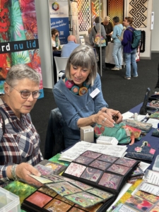 Zaterdagmiddag gaf Jeannette Evers een demonstratie ATC kaartjes waar veel aandacht voor was. ATC’s zijn kleine kaartjes die onderling geruild worden. De kaartjes hebben maar een regel, de maat, die is 6,4 x 8,9 cm. Ze worden met veel technieken gemaakt: 3D, borduren, collage, tekenen, schilders, van alles bij en door elkaar en stempelen.