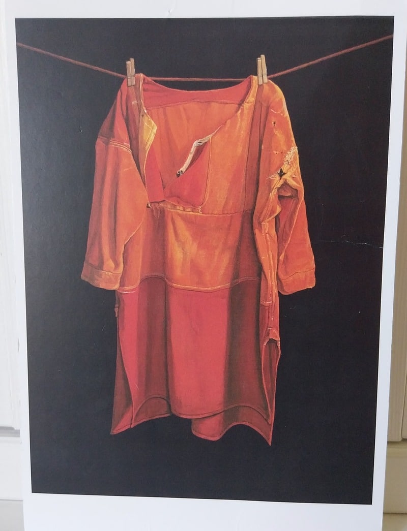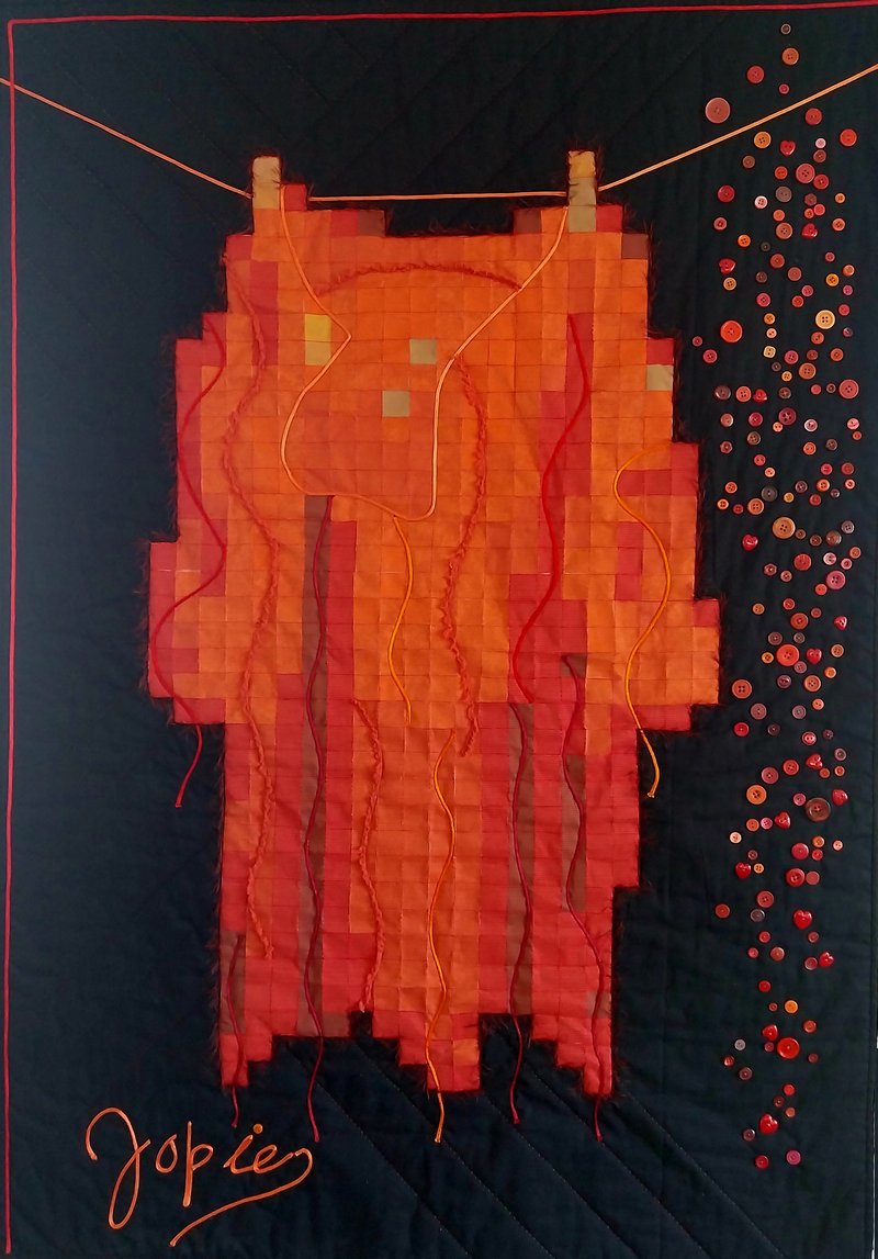In maart dit jaar had Baukje het 2 jaarlijkse quiltmidweek, een evenement georganiseerd door quiltwinkel De Quiltkoffer uit Dokkum. Zij kregen een “geheime” opdracht om vooraf thuis een bekend schilderij om te zetten naar een uitvoering in stof. Zij koos daarvoor toen het “roodbaaien hemd” geschilderd door Jopie Huisman (uit het museum in Workum) en heeft deze in pixels uitgevoerd.